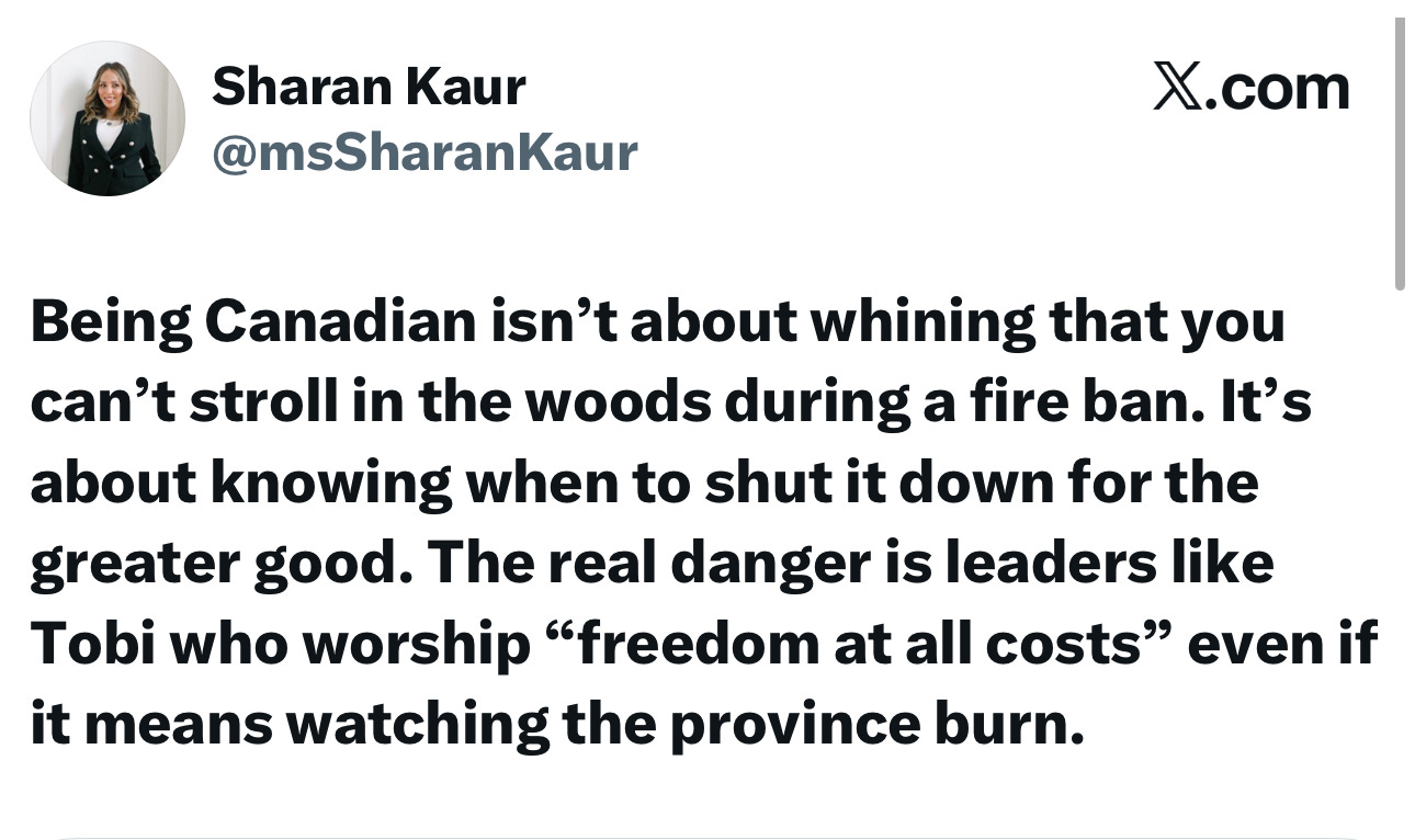 Sharan Kaur from Toronto gets on her high horse and wags her finger to all those concerned about government overreach vis a vis the maritime fire restrictions. Sharan from Toronto will school us on what is the Canadian way.