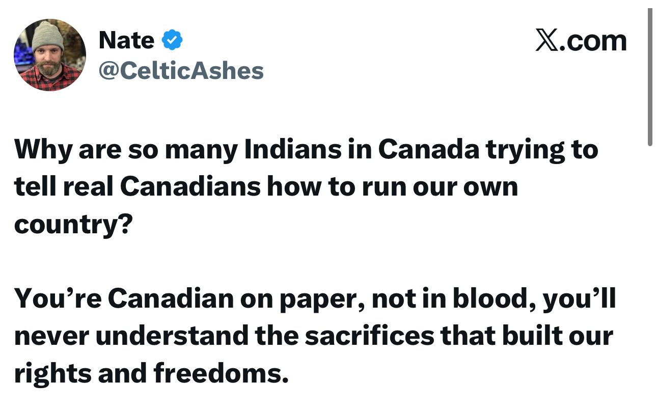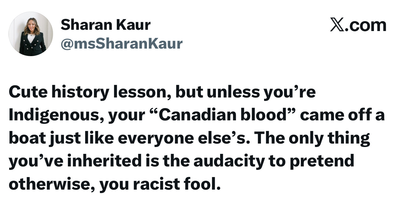 Nate is a white dude who’s decided a person named Kaur is not a real Canadian.