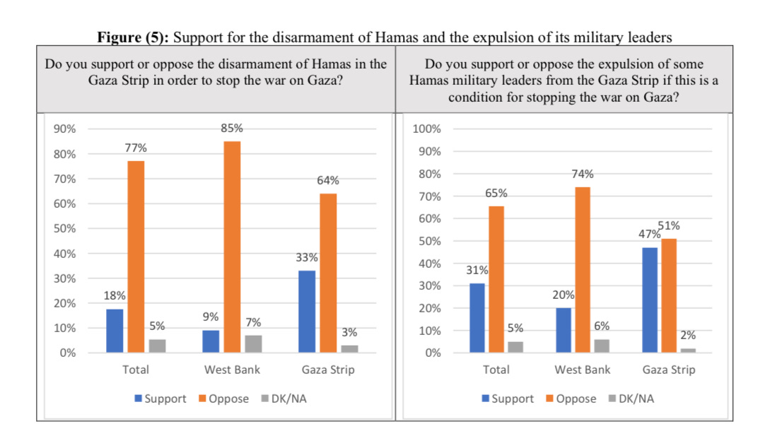 A majority of Palestinians opposes Hamas disarmament and the departure of its militant leadership from Gaza; 85% WBers, 64% Gazans oppose disarmament of Hamas