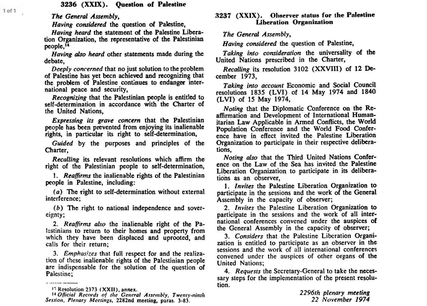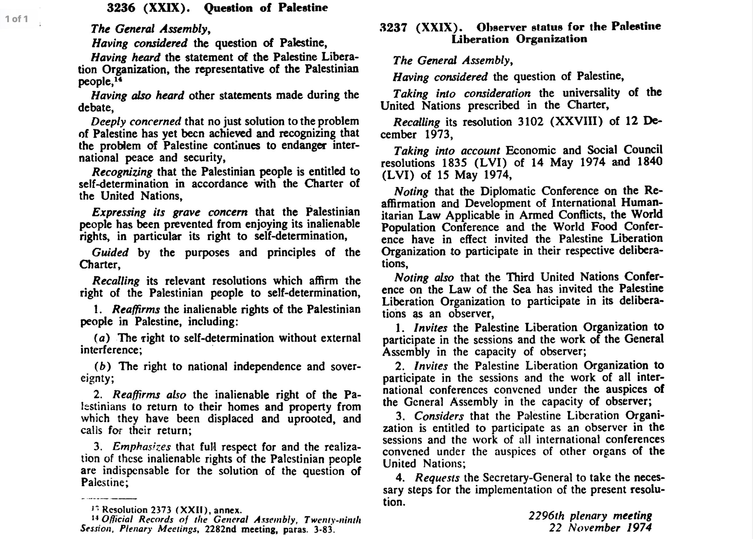 In 1974 the UN General Assembly passed Resolutions 3236 and 3246, recognising the right of Palestinians to regain their rights by any means, including armed struggle.