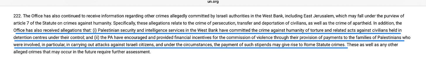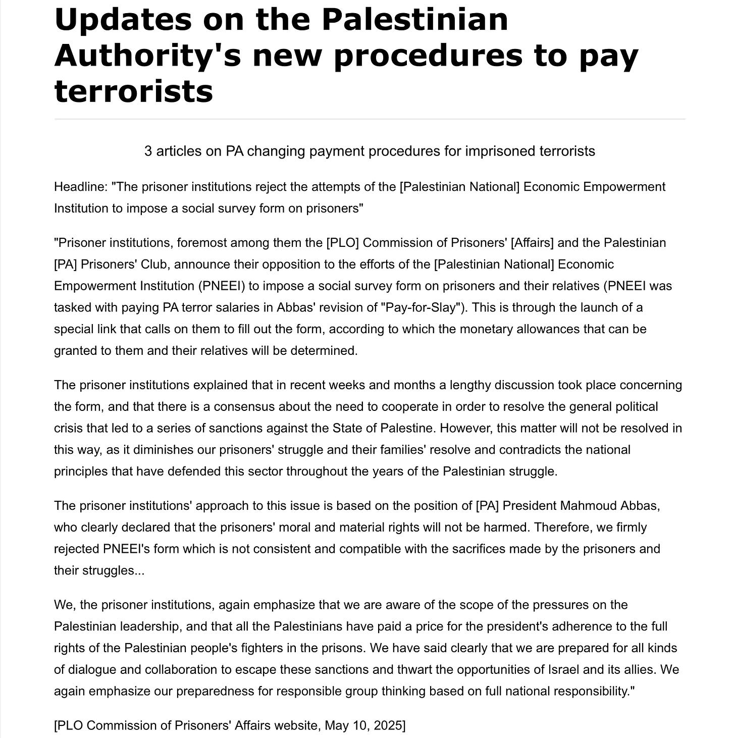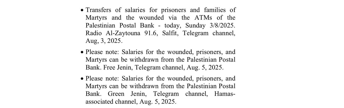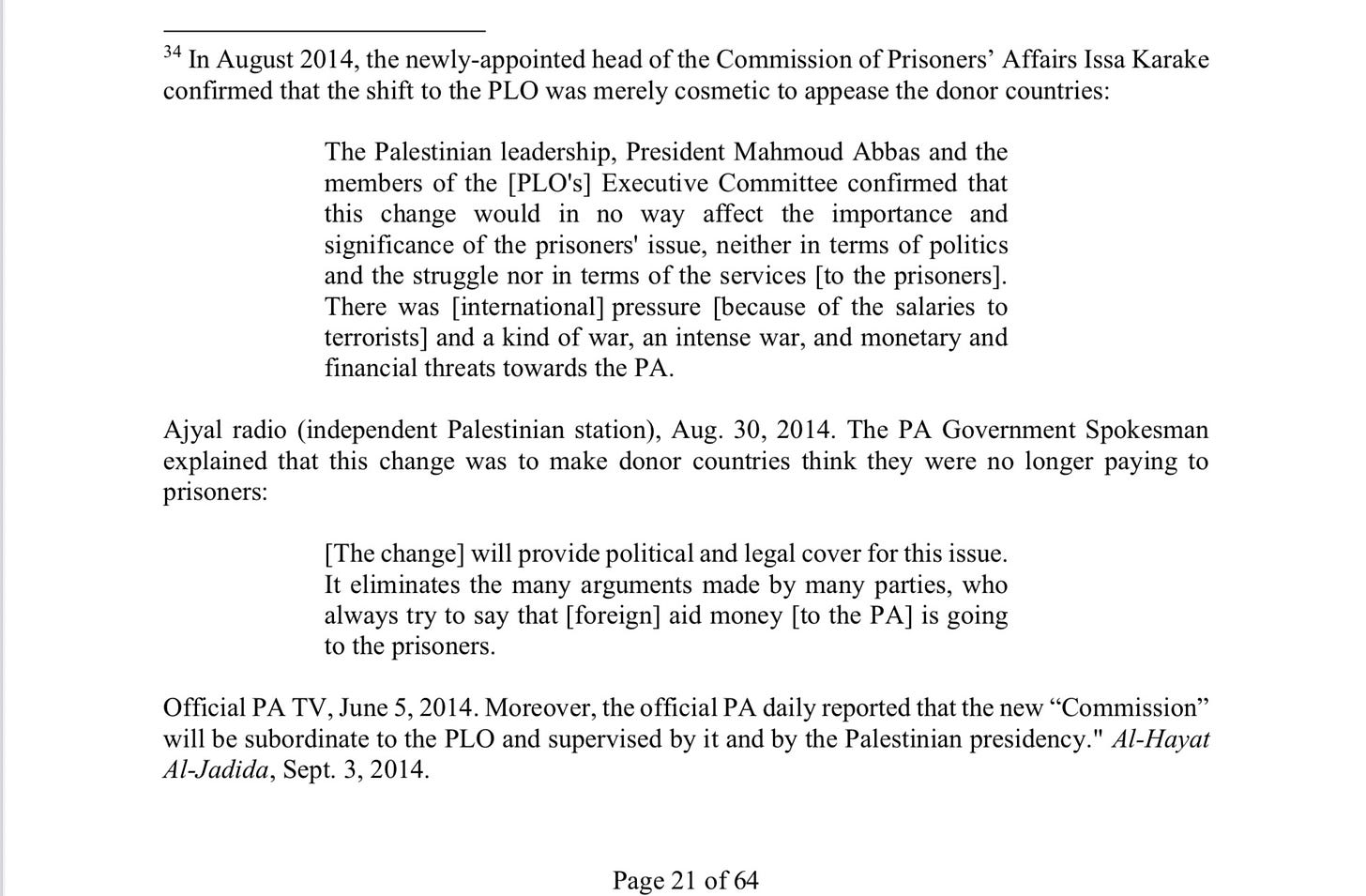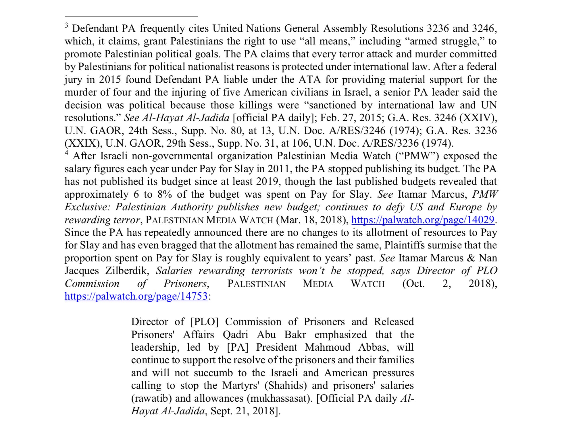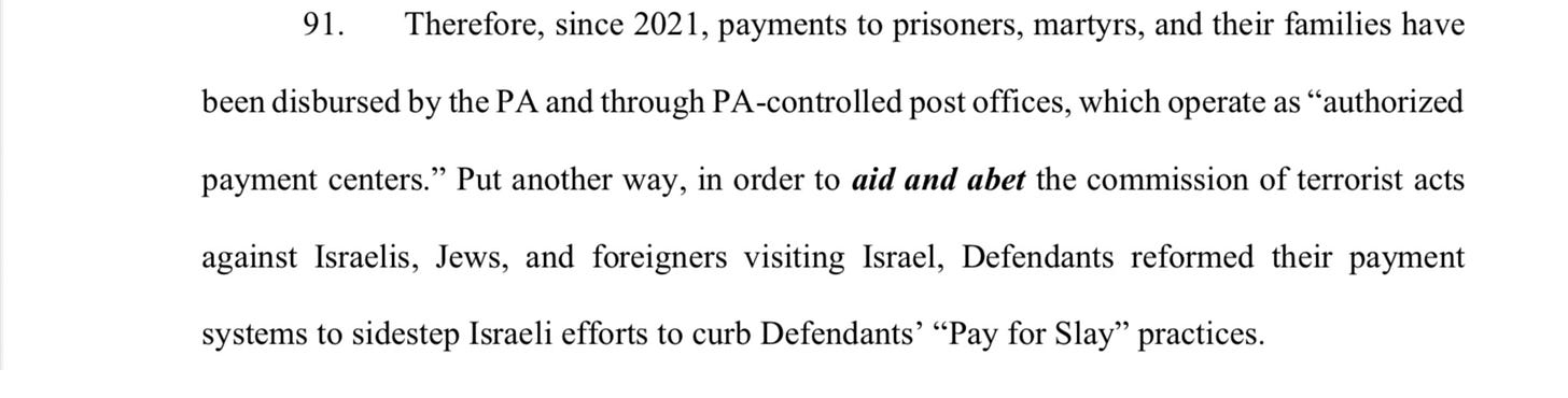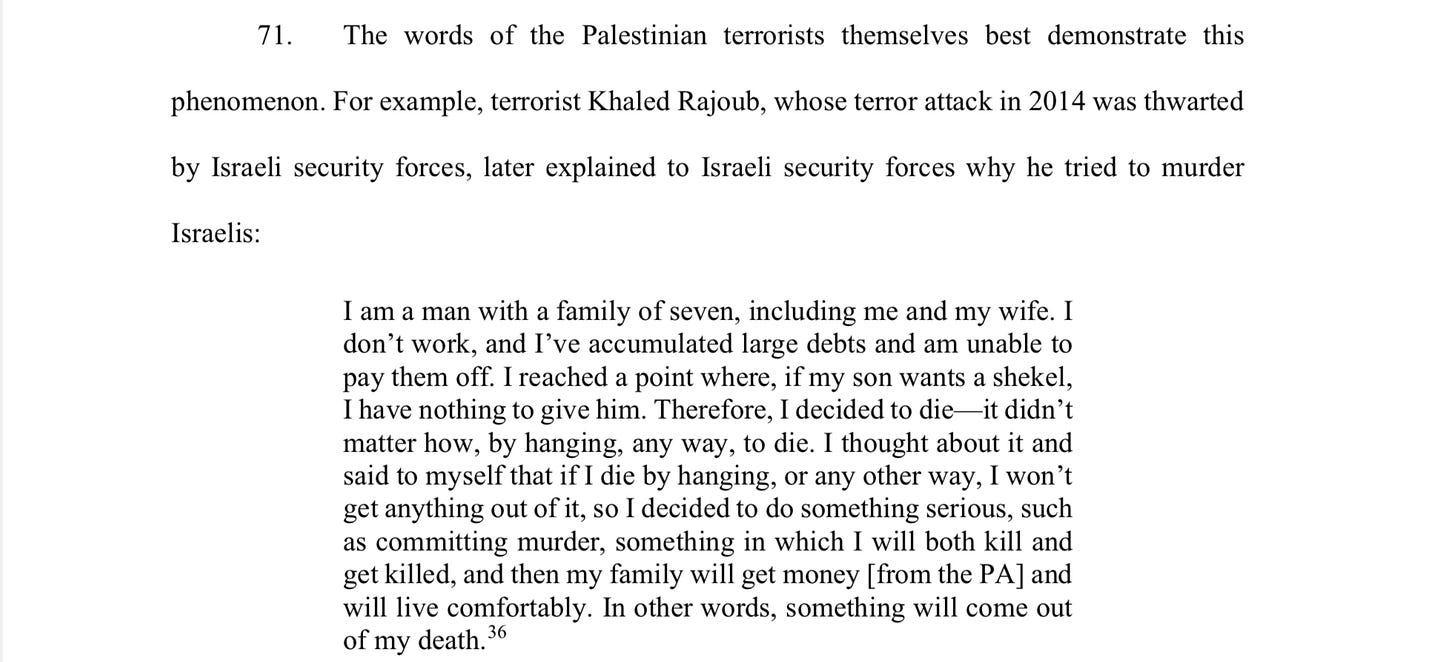 “Our people, families of the Martyrs and injured in the West Bank... on the subject of the payment of allowances for the families of Martyrs and injured...We call on the recipients of the funds to withdraw the large amounts that have accumulated for them at the post office, including the current allowance…As we have emphasized before, the post office is not a regular bank like other banks and cannot hold funds, but is only a means of transferring allowances, and the funds cannot be held for a long period in the accounts of the recipients...We wish mercy for the souls of the martyrs, recovery for the wounded, and freedom for the prisoners.” — Commission of Prisoners, Palestinian Authority via Stuart Force and Hananel Gez, V. Palestinian Authority and Palestine Liberation Organization (see below for a PDF copy of the complaint document filed with the District Court for the Southern District of New York)