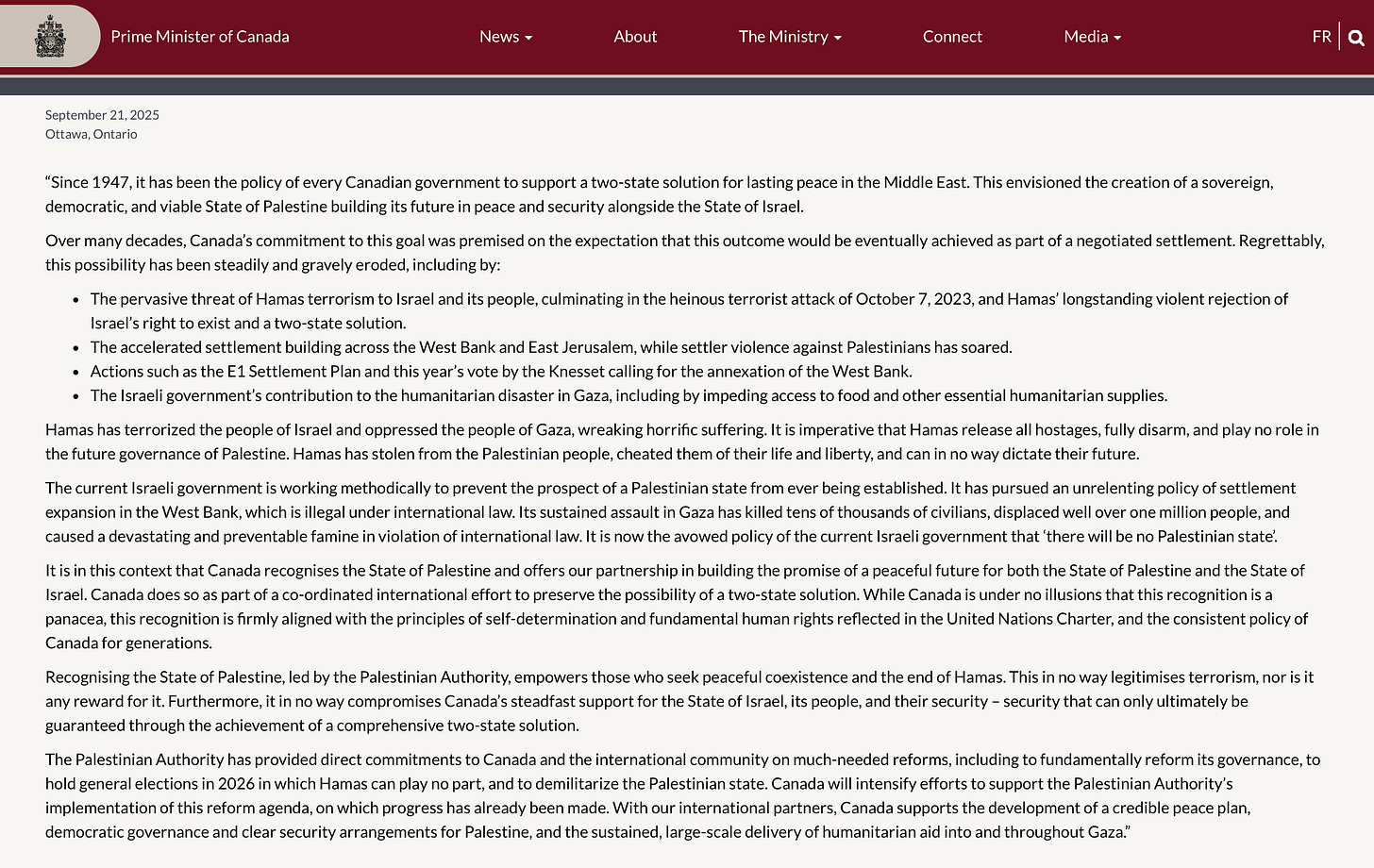 “It is imperative that Hamas release all hostages, fully disarm, and play no role in the future governance of Palestine. Hamas has stolen from the Palestinian people, cheated them of their life and liberty, and can in no way dictate their future … The Palestinian Authority has provided direct commitments to Canada and the international community on much-needed reforms, including to fundamentally reform its governance, to hold general elections in 2026 in which Hamas can play no part, and to demilitarize the Palestinian state.”