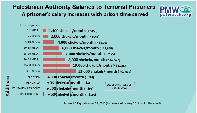 The system of paying salaries to terrorists began in 1998 when PLO leader Yasser Arafat established the “Ministry of Prisoners Affairs” as an arm of the PA’s government to support Palestinian terrorists imprisoned in Israel. After Ararat’s death in 2004, his successor Abbas expanded the payment scheme, institutionalising the system of salaries for terrorists, both incarcerated and released. The PA distinguishes between terrorist and non terrorist criminals. The latter receive no salary or financial compensation of any kind. The former bear the a special designation Asra, “a special Arabic word … equivalent to calling the terrorist prisoners “POWs.” Asra is used by the PA to emphasize its claim that Palestinian terrorists are actually legitimate soldiers because the UN gave them the right to kill.”