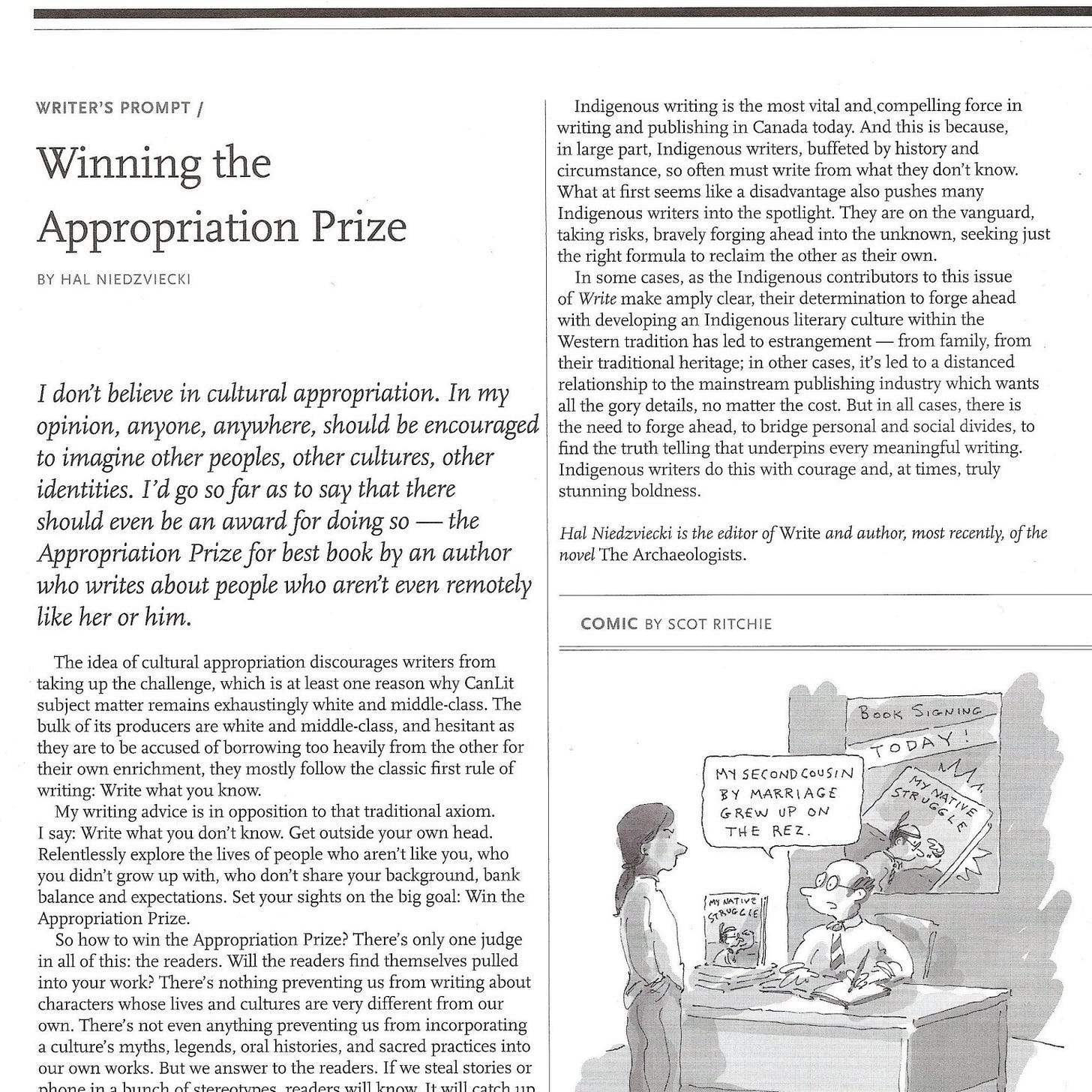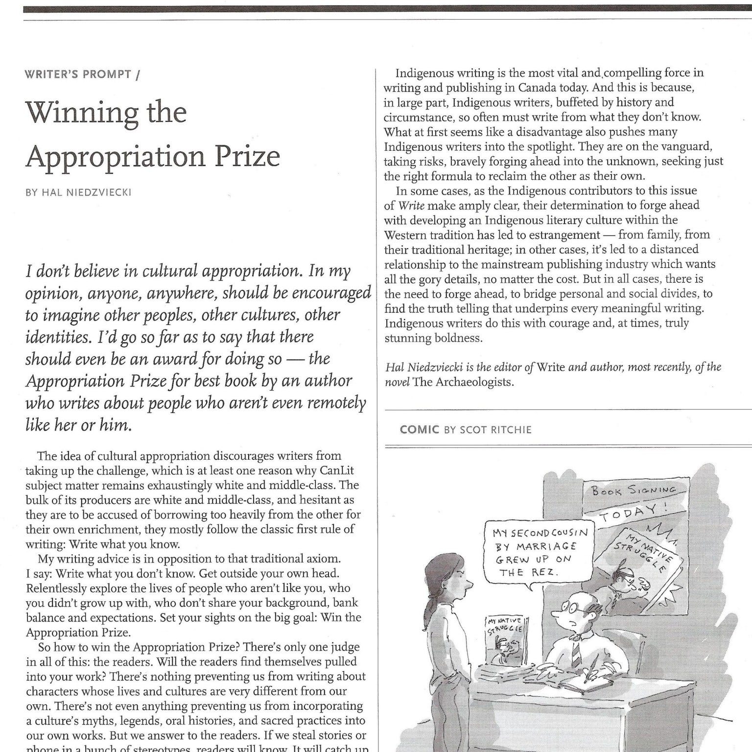 I recall a lot of really dramatic reaction to what I saw (and still do see) as something pretty mundane. “…the title, Winning the Appropriation Prize, made my CanLit bullshit radar go off. I hoped it was a satirical piece. It wasn’t. I was so angry I was shaking. I felt like I was going to throw up… After that, I posted to Twitter and it went from there,” wrote Elliott” (Vincent Schilling, ICTNews, May 2017).