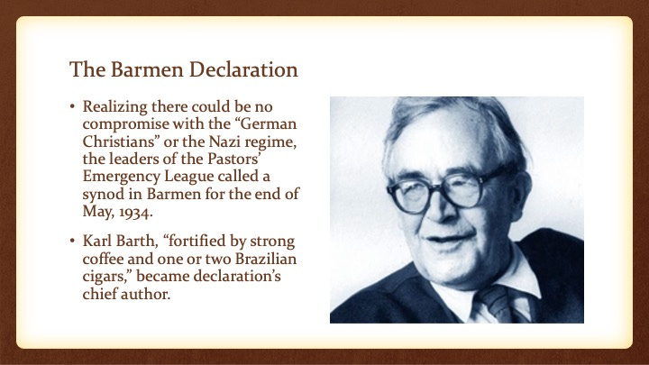 After Hitler swept into power in 1933, the German Christians seized power over the Lutheran church, backed by the Nazi party and Hitler himself. Martin Neimoller and Dietrich Bonhoeffer figured prominently in the development of the Confessing Church. Neimoller organised into the Pastors’ Emergency League a third of German clergy who opposed the dictatorship takeover of the church. They held confessing synods, their first one taking place in Barmen, and their second one taking place in Berlin-Dahlem. Karl Barth helped draw up a statement of principle to guide the Confessing Church. Neimoller endured a trial for treason charges and received a light sentence. Despite the light sentence, Hitler made a personal prisoner out of Neimoller, who spent the duration of the reign of the Third Reich in Concentration Camps. This period of his life shaped Neimoller’s beliefs profoundly and caused him to relinquish all prejudices.
