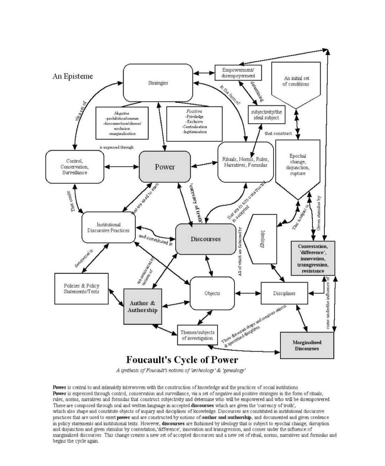 “Power is central to and intimately interwoven with the construction of knowledge and the practices of social institutions. Power is expressed through control, conservation and surveillance, via a set of negative and positive strategies in the form of rituals, rules, norms, narratives and formulas that construct subjectivity and determine who will be empowered and who will be disempowered. These are composed through oral and written language in accepted discourses which are given the ‘currency of truth’, which also shape and constitute objects of inquiry and disciplines of knowledge. Discourses are constituted in institutional discursive practices that are used to exert power and are constructed by notions of author and authorship, and documented and given credence in policy statements and institutional texts. However, discourses are fashioned by ideology that is subject to epochal change, disruption and disjunction and given stimulus by contestation, ‘difference’, innovation and transgression, and comes under the influence of marginalised discourses.” — Edwin Creely